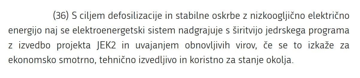 Hkrati državni sekretar Levičar piše tudi o "usmeritvi za nadgradnjo elektro-energetskega sistema s širitvijo jedrskega programa". To določa 36. točka resolucije. Cilj je opuščanje fosilnih goriv in stabilna oskrba z nizkoogljično električno energijo. Strinjamo se torej, da potrebujemo naslednji korak - nacionalno strategijo, k je predmet našega poziva.